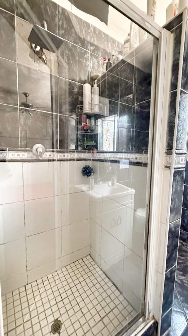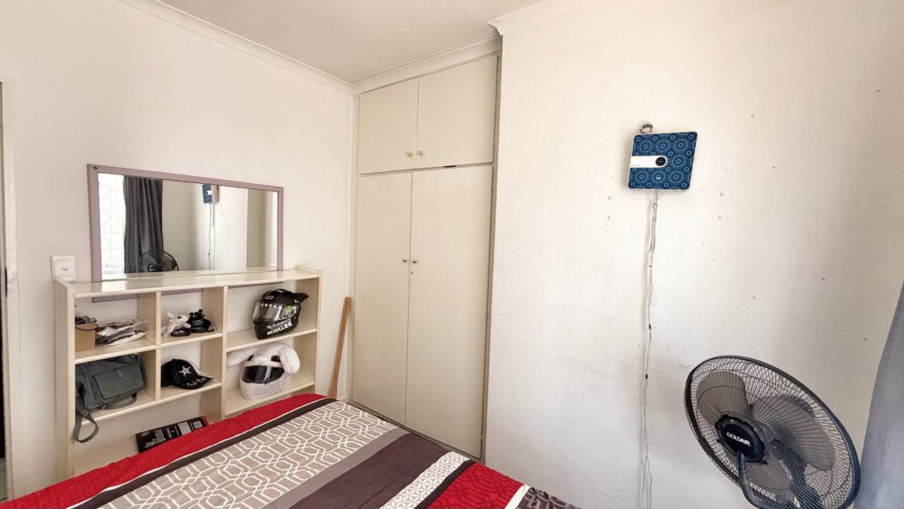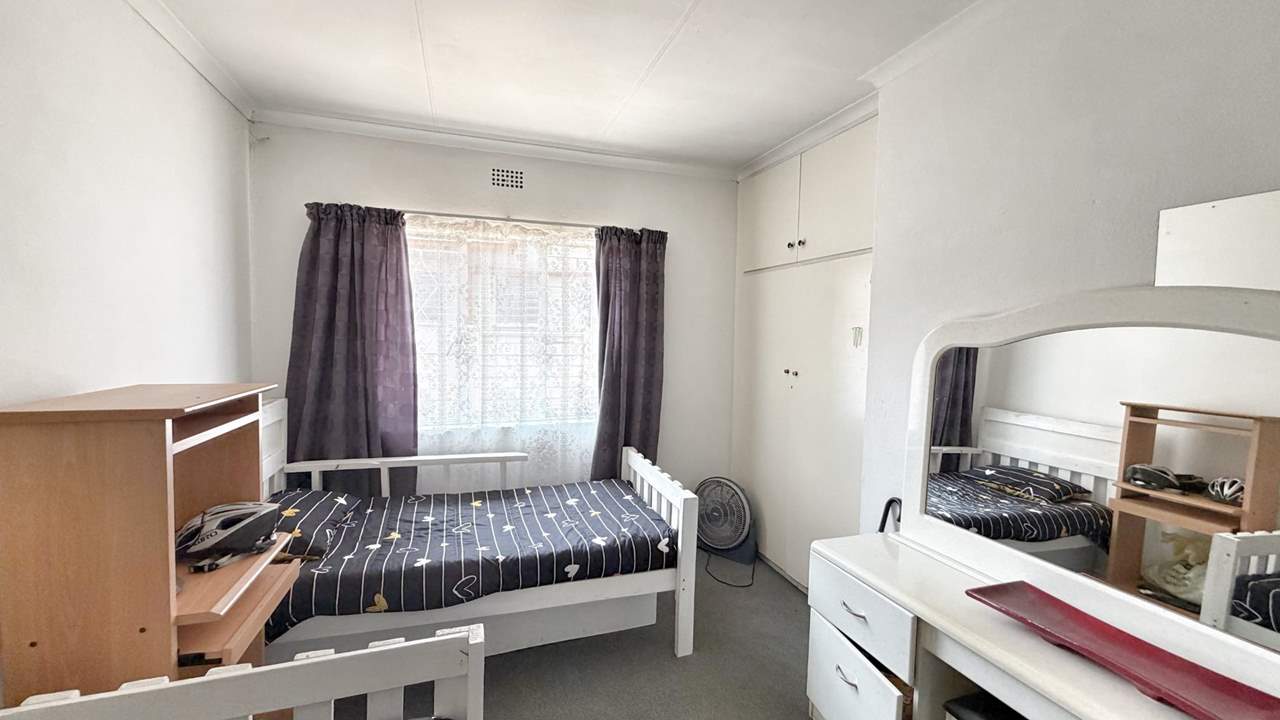 To the right of the entrance hall, the home offers three well-sized, carpeted bedrooms with built-in cupboards, as well as a convenient linen cupboard in the passage. The first two bedrooms share a neat bathroom complete with bath, basin, and toilet. The main bedroom features its own en-suite bathroom with shower, basin, and toilet, providing privacy and comfort.